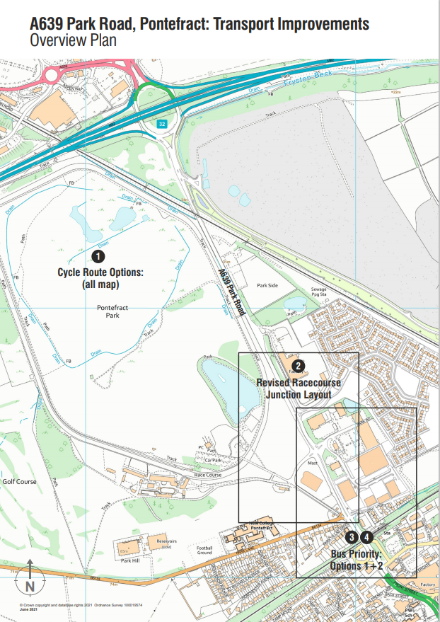 - Improved cycle route between Pontefract town centre and junction 32 retail park/ Xscape either by either improving the existing off road route (option 1) or by developing a new route part of which runs next to the A639 Park Road (option 2).