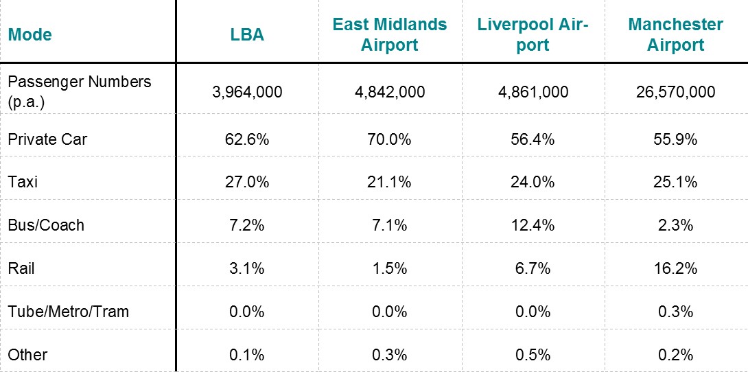 Civil Aviation Authority data shows that in 2017 approximately 10% of journeys to LBA were by public transport, of which 3% was by Rail. Evidence suggests that the predominant mode of transport to any UK airport is via car (private car journey or taxi). Airports with rail connections (either direct or parkway) are known to be accessed by car over 80% of the time (car accounts for 80% of the mode share), highlighting that road access is critical for any airport.