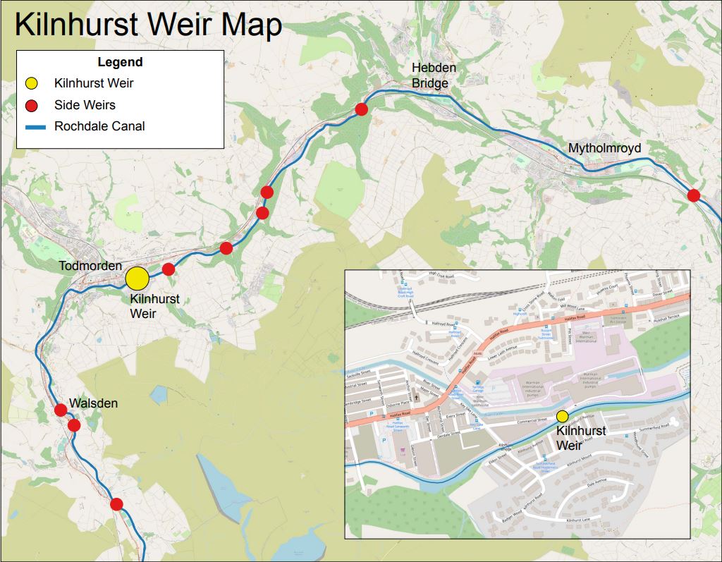 Between Todmorden and Luddenden Foot, there are seven weirs, Kilnhurst Weir can be found between Key Sike Lane and Woodhouse Road on the Rochdale Canal.