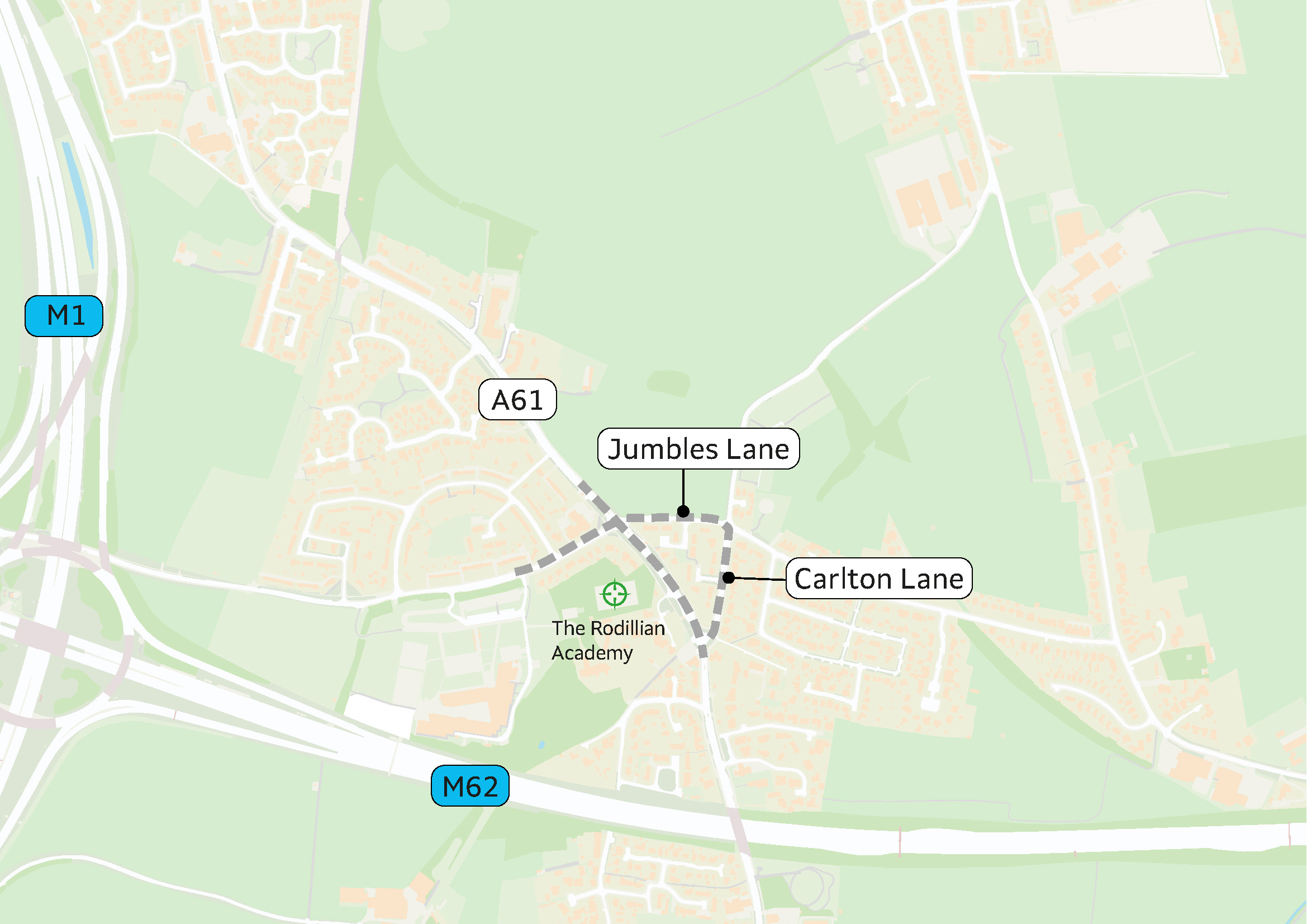 Create a road closure for motor vehicles at the Carlton Lane/A61 junction. This is a hotspot for collisions, and vehicles travel at speed along the road. Motor vehicles will access Carlton Road via Jumbles Lane