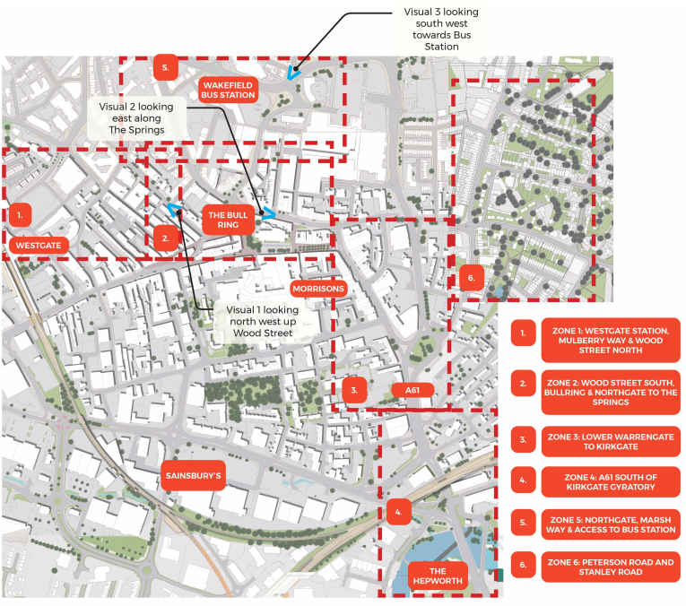 The map below is an overview of how the proposals we are consulting on are situated across Wakefield city centre. You can view the map more closely with the other consultation documents at the top of the web page or click to view the map (opens in a new tab).