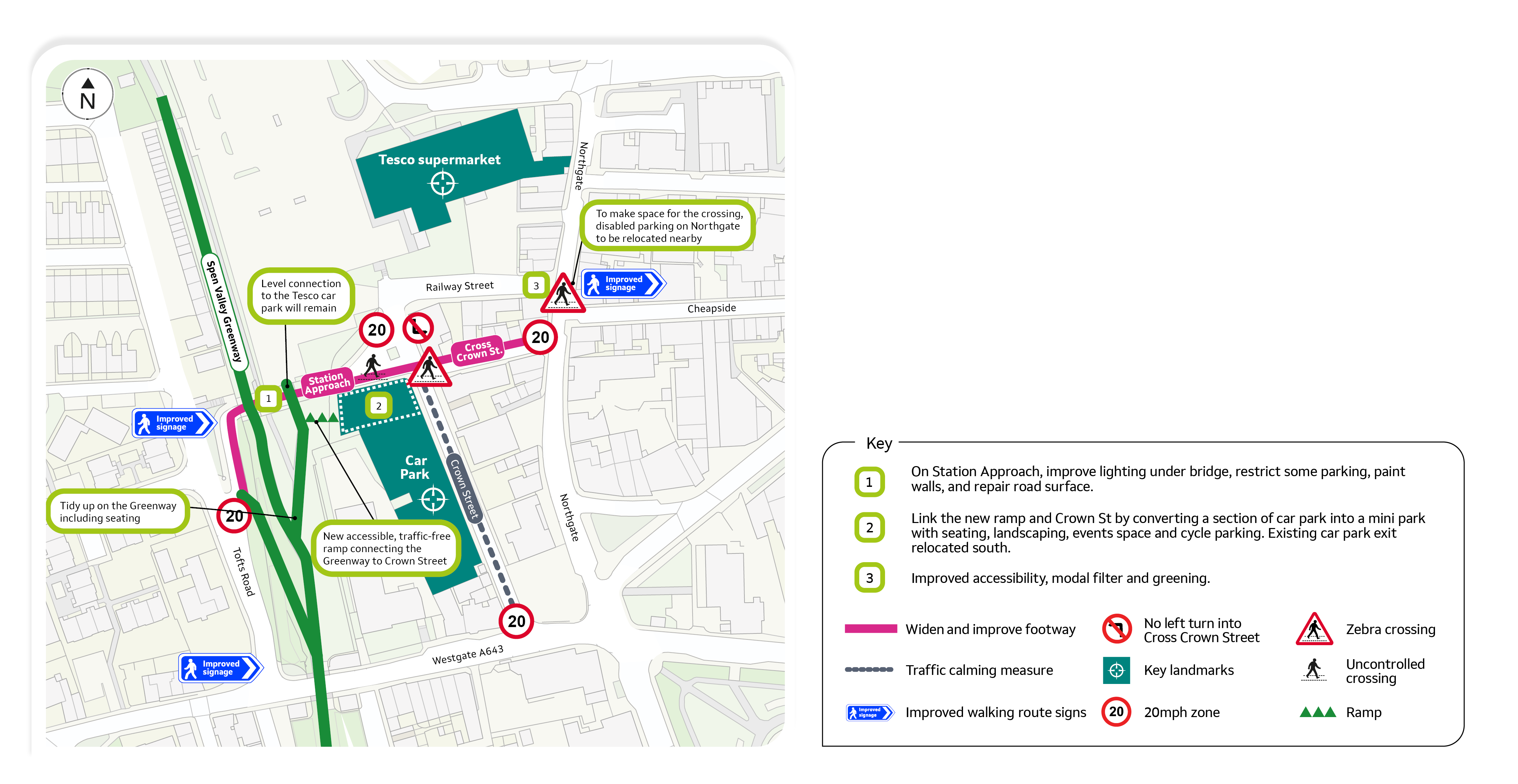 New uncontrolled crossing over Station Approach to the proposed new green space within Crown Street car park